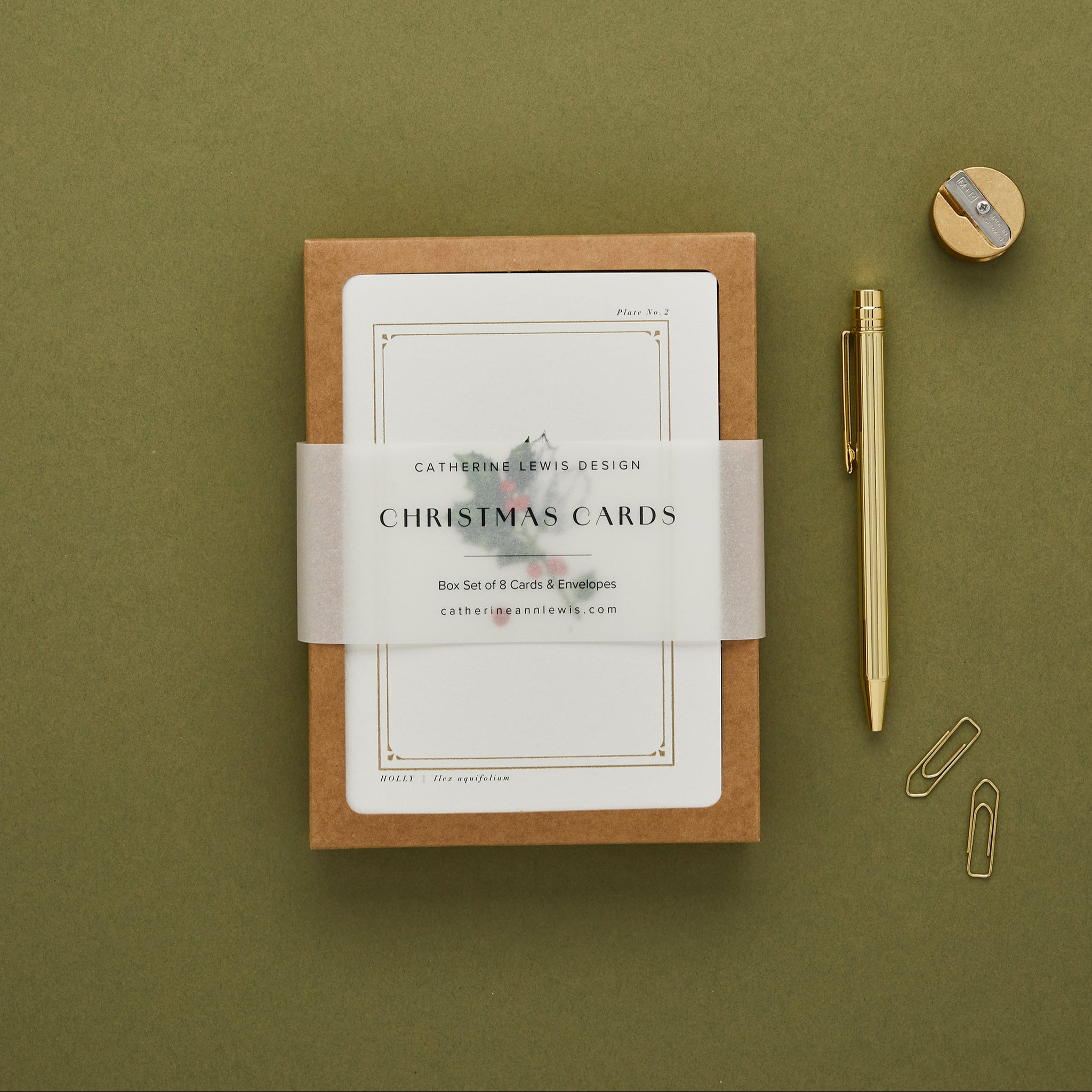 A pack of 8 intricately drawn luxury Christmas greeting cards with illustrations of festive plants from the 'Botanist Archive: Festive Edition' Collection' by Catherine Lewis Design.