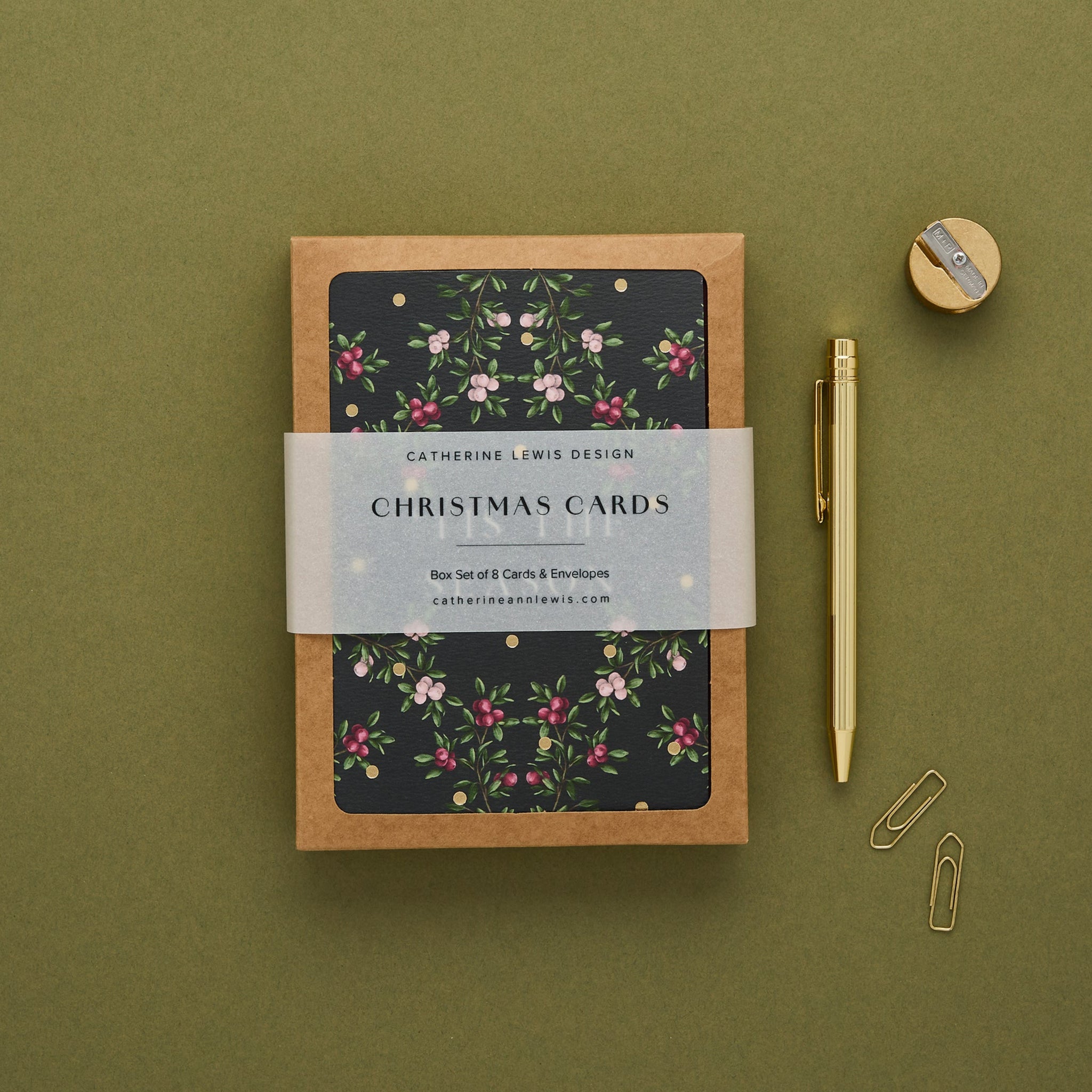A pack of 8 intricately drawn luxury Christmas greeting cards with illustrations of festive plants from the 'Merry Nouveau Collection' by Catherine Lewis Design.