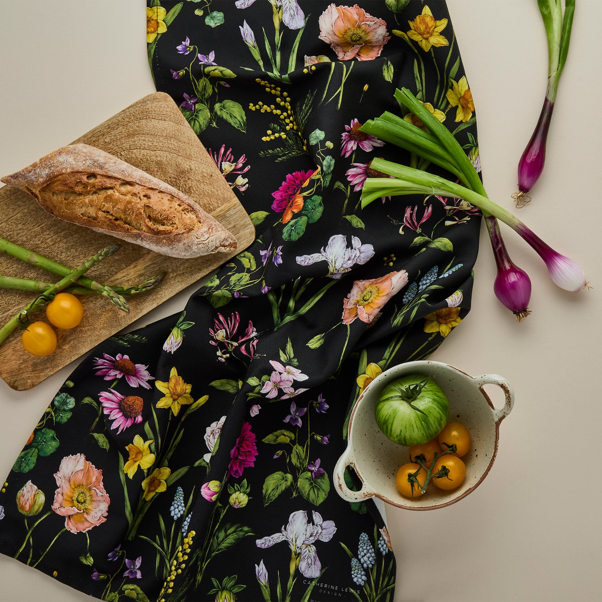 Intricately drawn Bountiful Blooms Tea Towel design on a black base. Printed on a high quality thick 100% Cotton and made right here in the UK.