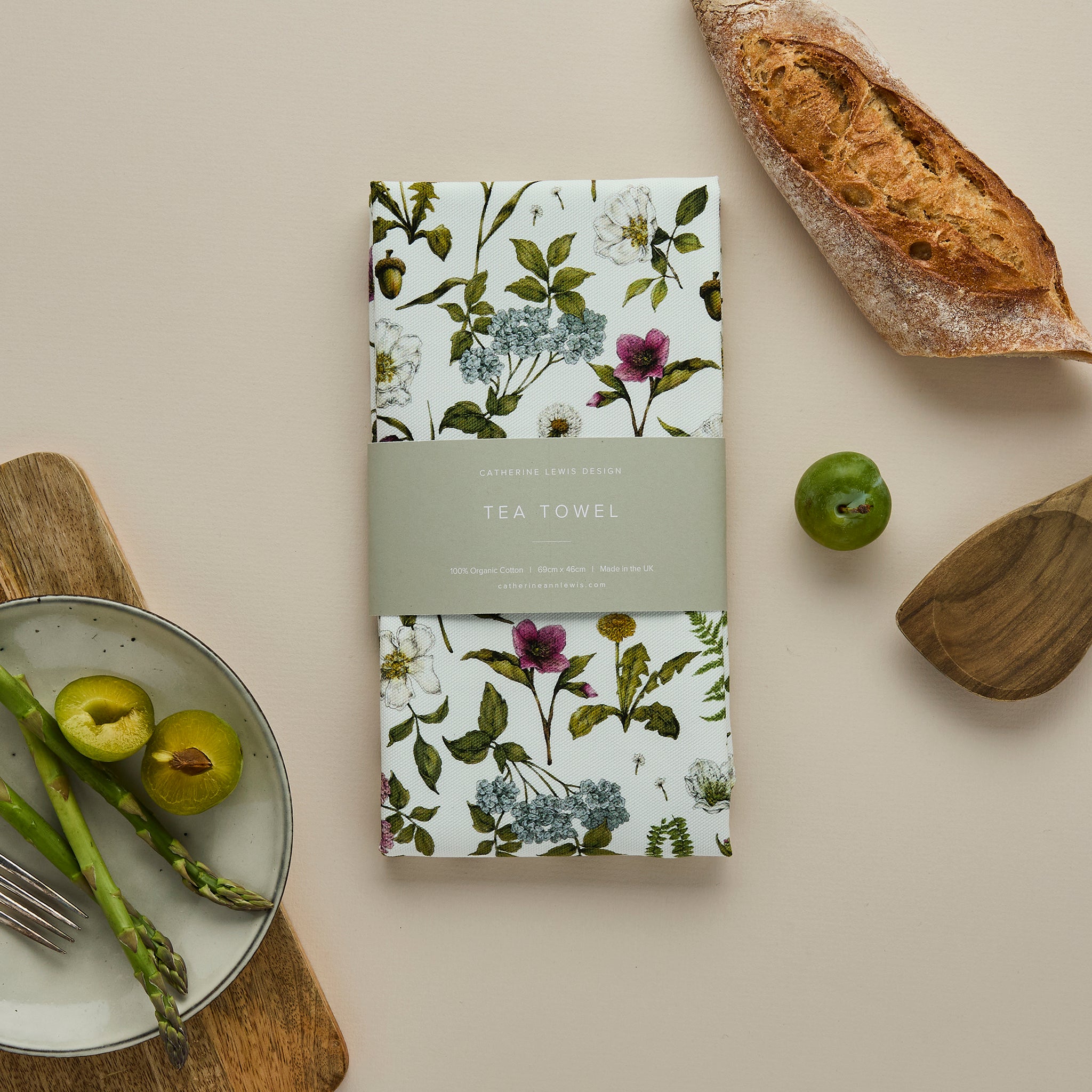Intricately drawn Cottage Garden Tea Towel design on an ivory base. Printed on a high quality thick 100% Cotton and made right here in the UK.